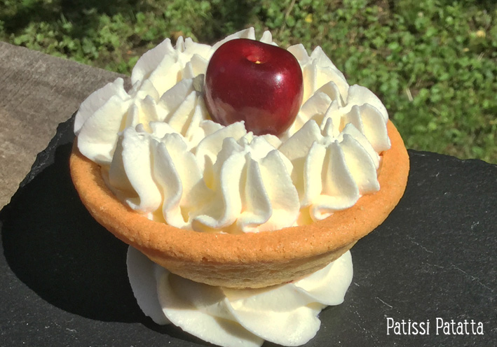 Des coupelles en sablé breton, une compotée de cerises et une chantilly au mascarpone, voici le dessert gourmand que j’ai imaginé.